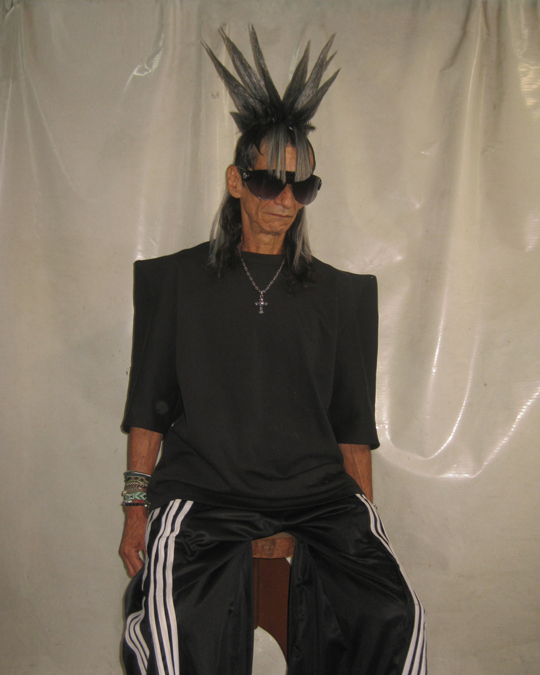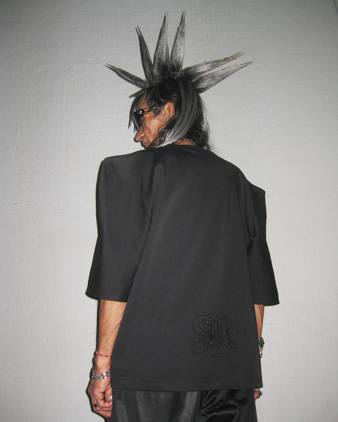 almost black shirt with pointy shoulders and rhinestones. model wearing size M. For more info on sizing dm @manchad0